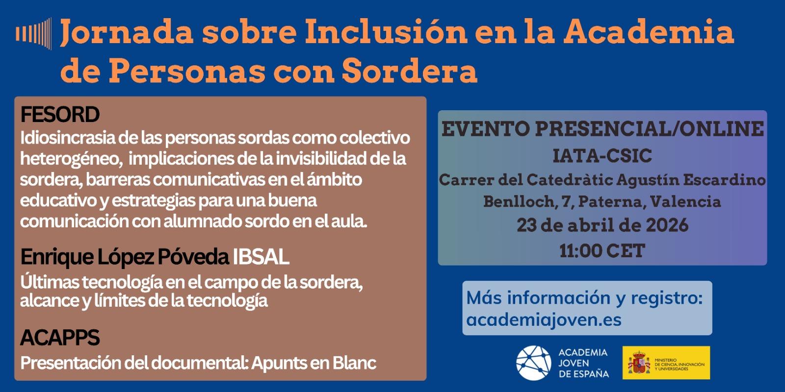 Jornada sobre inclusión en la academia de personas con sordera 23/04/2026 Te invitamos a esta jornada para reflexionar sobre la inclusión y la accesibilidad en el ámbito académico.