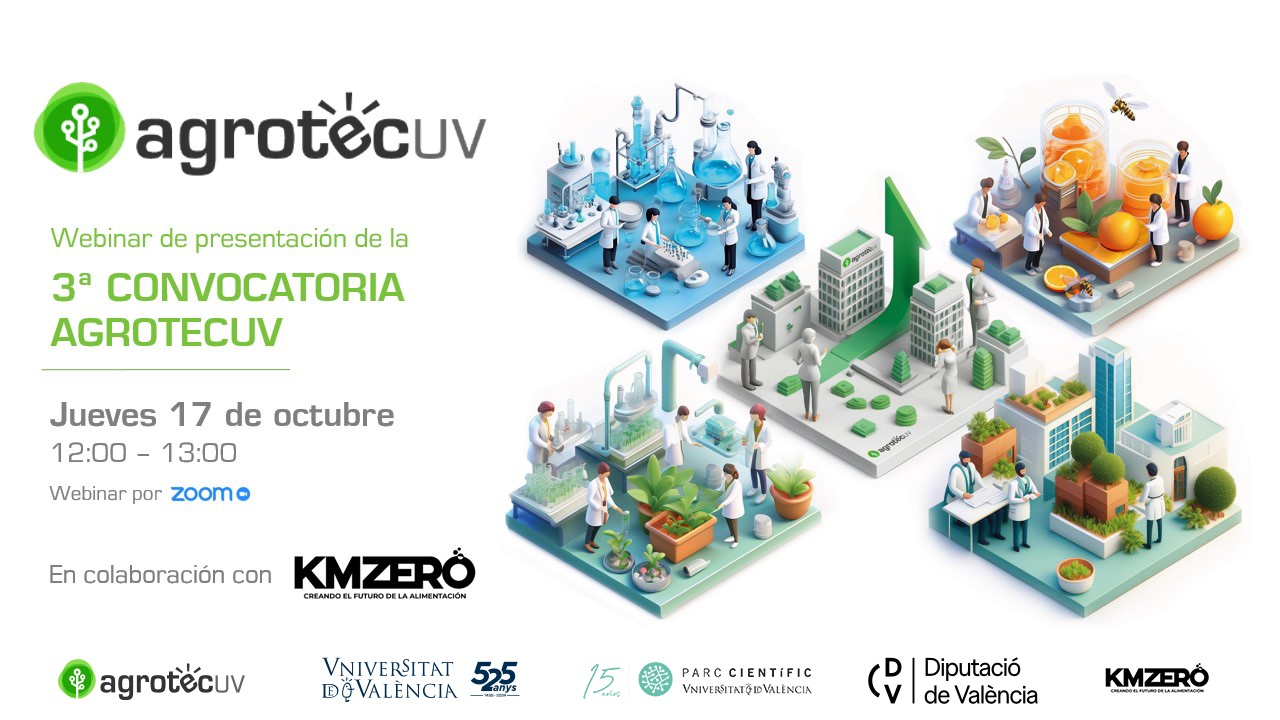 AgrotecUV | Webinar de presentación de la 3ª Convocatoria AgrotecUV Te invitamos a asistir al webinar de presentación de la 3ª Convocatoria AgrotecUV junto con KmZero el próximo 17 de octubre